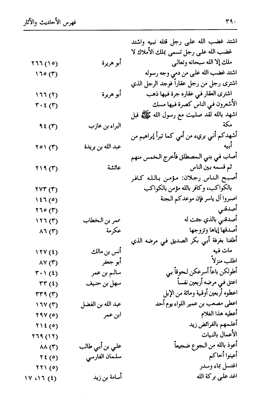 اشْتَدَّ غَضَبُ اللَّهِ عَلَى رَجُلٍ قَتَلَهُ نَبِيُّهُ وَاشْتَدَّ غَضَبُ اللَّهِ عَلَى رَجُلٍ تَسَمَّى بِمَلِكِ الأَمْلاكِ لا مَلِكَ إِلا اللَّهُ سُبْحَانَهُ وَتَعَالَى/ أبو هريرة/ (15) 266 اشتد غضب الله على من دمى وجه رسوله// (3) 165 اشْتَرَى رَجُلٌ مِنْ رَجُلٍ عَقَارًا فَوَجَدَ الرَّجُلُ الَّذِي اشْتَرَى الْعَقَارَ فِي عَقَارِهِ جَرَّةً فِيهَا ذهب/ أبو هريرة/ (2) 166 الأشعرون في الناس كصرة فيها مسك// (3) 304 أَشْهَدُ باللَّه لَقَدْ صَلَّيْتُ مَعَ رَسُولِ اللَّهِ صَلَّى اللهُ عَلَيْهِ وَسَلَّمَ قبل مكة/ البراء بن عازب/ (3) 94 أشهدكم أني بريء من أمي كما تبرأ إبراهيم من أبيه/ عبد الله بن بريدة/ (3) 251 أصاب في بني المصطلق فأخرج الخمس منهم ثم قسمه بين الناس/ عائشة/ (3) 219 أصبح الناس رجلان: مؤمن باللَّه كافر بالكواكب، وكافر باللَّه مؤمن بالكواكب// (3) 273 اصبروا آل ياسر فإن موعدكم الجنة// (5) 146 أصدقني// (3) 265 أصدقني بالذي جئت له/ عمر بن الخطاب/ (3) 126 أصدقها إياها وتزوجها/ عكرمة/ (3) 86 أَطَفْنَا بِغُرْفَةِ أَبِي بَكْرٍ الصِّدِّيقِ فِي مَرَضِهِ الّذي مات فيه/ أنس بن مالك/ (4) 127 اطلب منزلا/ أبو جعفر/ (3) 87 أطولكن باعا أسرعكن لحوقا بي/ سالم بن عمر/ (4) 301 أعتق في مرضه أربعين نفسا/ سهل بن حنيف/ (4) 33 أعطوه أربعين أوقية ومائة من الإبل// (3) 339 اعطى مصعب بن عمير اللواء يوم أحد/ عبد الله بن الفضل/ (3) 167 أعطيه هذا الغلام/ ابن عمر/ (5) 297 أعلمهم بالفرائض زيد// (5) 214 الأعمال بالنيات// (12) 269 أعوذ باللَّه من الجوع ضجيعا/ علي بن أبي طالب/ (3) 88 أعينوا أخاكم/ سلمان الفارسيّ/ (5) 24 اغتسل بماء وسدر// (5) 221 أغد على بركة الله/ أسامة بن زيد/ (4) 16، 17