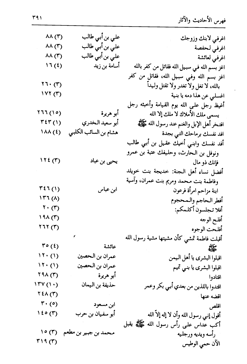اغرفي لابنك وزوجك/ علي بن أبي طالب/ (3) 88 اغرفي لحفصة/ علي بن أبي طالب/ (3) 88 اغرفي لعائشة/ علي بن أبي طالب/ (3) 88 اغز بسم الله في سبيل الله فقاتل من كفر باللَّه/ أسامة بن زيد/ (4) 16 اغز بسم الله وفي سبيل الله، فقاتل من كفر باللَّه، لا تغل ولا تغدر ولا تقتل وليدا// (3) 260 اغسلي عن هذا دمه يا بنية// (3) 172 أَغْيَظُ رَجُلٍ عَلَى اللَّهِ يَوْمَ الْقِيَامَةِ وَأَخْبَثُهُ رَجُلٌ يُسَمَّى مَلِكَ الأَمْلاكِ لا مَلِكَ إِلا الله/ أبو هريرة/ (15) 266 افتخر أهل الإبل والغنم عند رسول الله صَلَّى اللهُ عَلَيْهِ وَسَلَّمَ/ أبو سعيد الخدريّ/ (1) 343 أفد نفسك برماحك التي بجدة/ هشام بن السائب الكلبي/ (4) 188 افد نفسك وابني أخيك عقيل بن أبي طالب ونوفل بن الحارث، وحليفك عتبة بن عمرو فإنك ذو مال/ يحيى بن عباد/ (3) 124 أَفْضَلُ نِسَاءِ أَهْلِ الْجَنَّةِ: خَدِيجَةُ بِنْتُ خُوَيْلِدٍ وَفَاطِمَةُ بِنْتُ مُحَمَّدٍ وَمَرْيَمُ بُنْتُ عِمْرَانَ، وَآسِيَةُ ابنة مزاحم امرأة فرعون/ ابن عباس/ (1) 346 أفطر الحاجم والمحجوم// (8) 136 أفلا تجلسون أكلمكم: // (3) 20 أفلح الوجه// (3) 198 أفلحت الوجوه// (3) 262 أَقْبَلَتْ فَاطِمَةُ تَمْشِي كَأَنَّ مِشْيَتَهَا مِشْيَةُ رَسُولِ الله صَلى اللهُ عَلَيه وَسَلَّمَ/ عائشة/ (4) 35 أقبلوا البشرى يا أهل اليمن/ عمران بن الحصين/ (1) 120 أقبلوا البشرى يا بني تميم/ عمران بن الحصين/ (1) 120 اقتادوا/ أبو هريرة/ (3) 298 اقْتَدُوا بِاللَّذَيْنِ مِنْ بَعْدِي أَبِي بَكْرٍ وَعُمَرَ/ حذيفة بن اليمان/ (10) 137 اقضه عنها// (3) 248 اقلص/ ابن مسعود/ (5) 30 أقول إني رسول الله وأن لا إله إلّا الله/ أبو سفيان بن حرب/ (3) 145 أكب عداس على رأس رسول الله صلى الله عليه وسلم يقبل رأسه ويديه ورجليه/ محمد بن جبير بن مطعم/ (3) 15 الآن حمي الوطيس// (3) 319