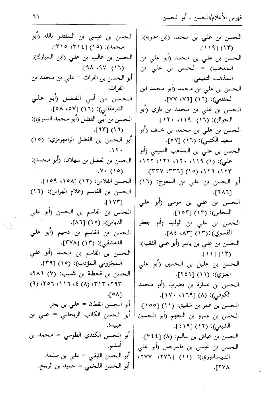 الحسن بْن عيسى بْن مَاسرجس (أبو علي النيسابورىّ) : (11) [276، 277، 278] . الحسن بن عيسى بن المقتدر باللَّه (أبو محمد) : (15) [314، 315] .