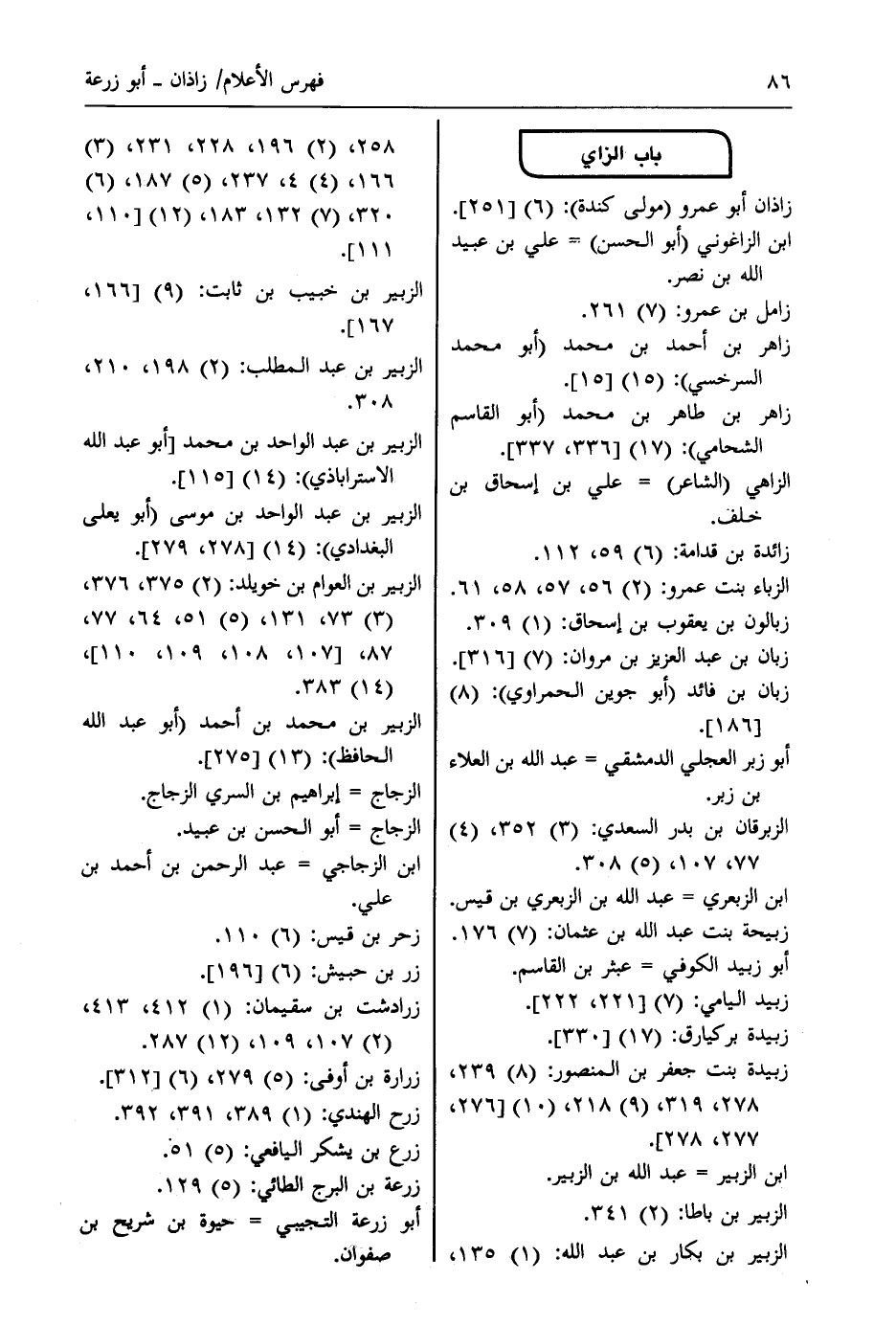 الزبير بن العوام بن خويلد: (2) 375، 376، (3) 73، 131، (5) 51، 64، 77، 87، [107، 108، 109، 110] ، (14) 383.
