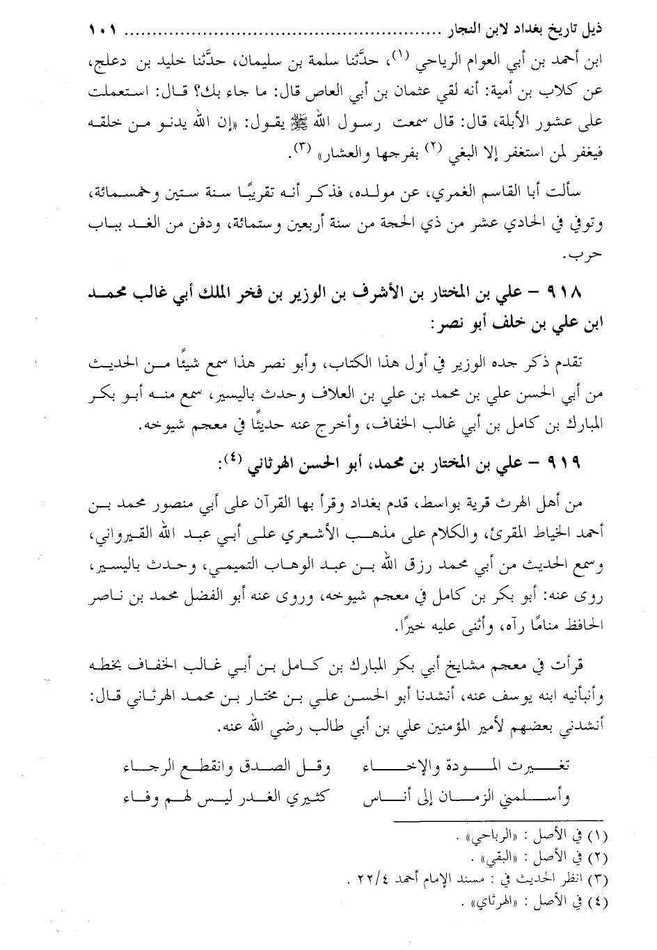 ابن أحمد بن أبي العوام الرياحي [1] ، حدّثنا سلمة بن سليمان، حدّثنا خليد بن دعلج، عن كلاب بن أمية: أنه لقي عثمان بن أبي العاص قال: ما جاء بك؟ قال: استعملت على عشور الأبلة، قال: قَالَ سَمِعْتُ رَسُولَ اللَّهِ صَلَّى اللَّهُ عَلَيْهِ وسلّم يقول: «إن الله يدنو من خلقه فيغفر لمن استغفر إلا البغي [2] بفرجها والعشار» [3] .