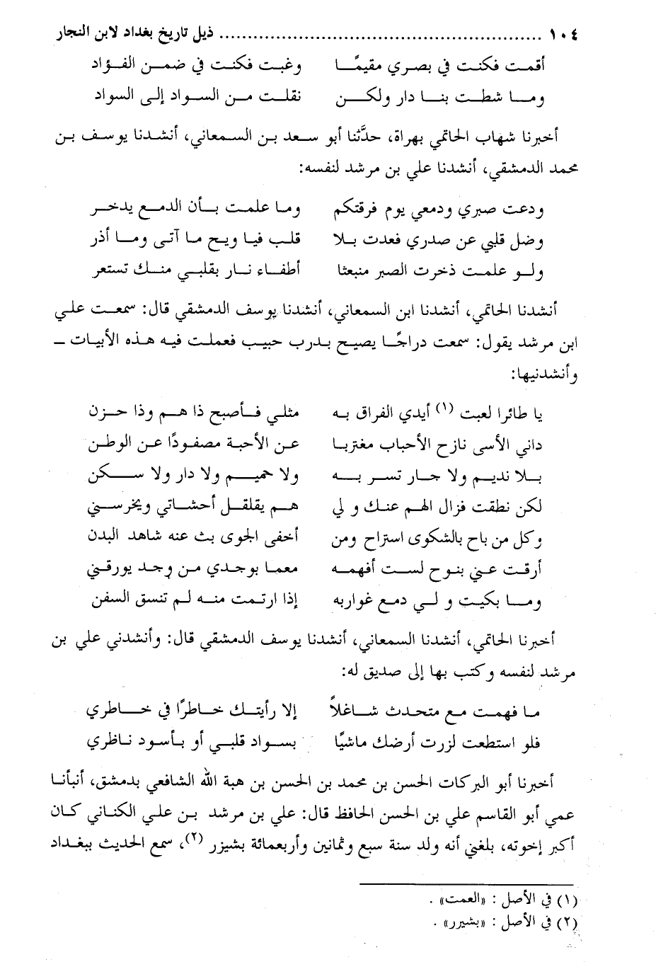أخبرنا شهاب الحاتمي بهراة، حدّثنا أبو سعد بن السمعاني، أنشدنا يوسف بن محمد الدمشقي، أنشدنا علي بن مرشد لنفسه: