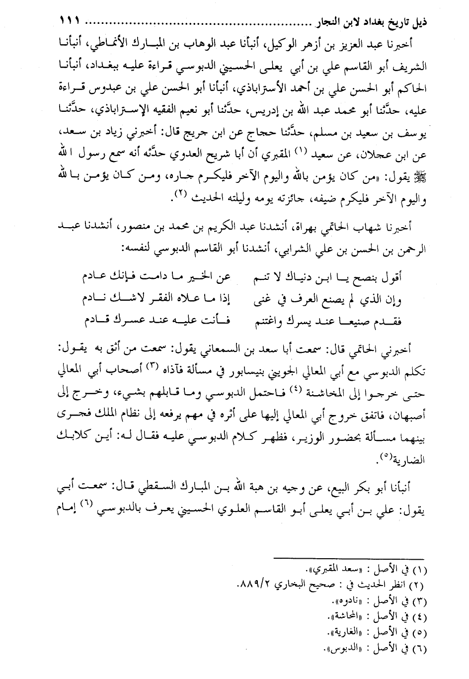 أخبرنا شهاب الحاتمي بهراة، أنشدنا عبد الكريم بن مُحَمَّد بن منصور، أنشدنا عبد الرحمن بن الحسن بن علي الشرابي، أنشدنا أبو القاسم الدبوسي لنفسه: