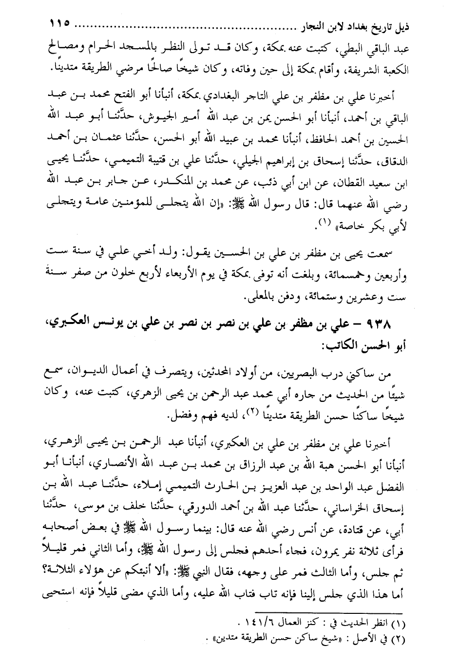 أخبرنا علي بن مظفر بن علي التاجر البغدادي بمكة، أَنْبَأَنَا أَبُو الْفَتْحِ مُحَمَّدُ بْنُ عَبْدِ الْبَاقِي بن أحمد، أنبأنا أبو الحسن يمن بن عبد الله أمير الجيوش، حَدَّثَنَا أَبُو عَبْدِ اللَّهِ الْحُسَيْنُ بْنُ أَحْمَدَ الحافظ، أنبأنا محمد بن عبيد الله أبو الحسن، حدّثنا عثمان بن أحمد الدقاق، حدّثنا إسحاق بن إبراهيم الجيلي، حدّثنا علي بن قتيبة التميمي، حدّثنا يحيى ابن سَعِيدٍ الْقَطَّانُ، عَنِ ابْنِ أَبِي ذِئْبٍ، عَنْ مُحَمَّدِ بْنِ الْمُنْكَدِرِ، عَنْ جَابِرِ بْنِ عَبْدِ الله رَضِيَ اللَّهُ عَنْهُمَا قَالَ: قَالَ رَسُولُ اللَّهِ صَلَّى اللَّهُ عَلَيْهِ وَسَلَّمَ: «إِنَّ اللَّهَ يَتَجَلَّى لِلْمُؤْمِنِينَ عَامَّةً وَيَتَجَلَّى لأبي بكر خاصة» [1] .