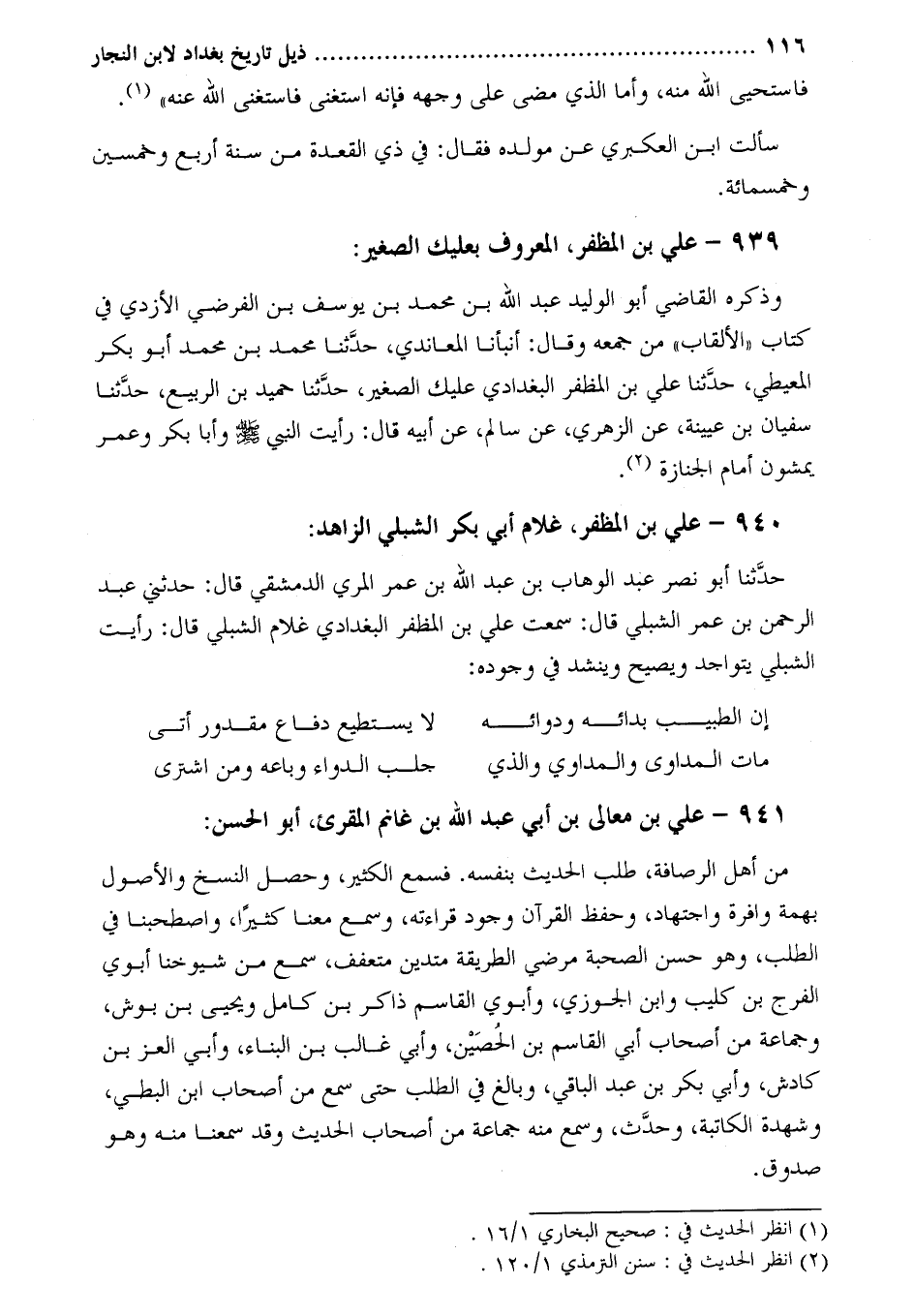 وذكره القاضي أبو الوليد عبد اللَّه بْن مُحَمَّد بْن يوسف بْن الفرضي الأزدي في كتاب «الألقاب» من جمعه وقال: أنبأنا المعاندي، حدّثنا محمد بن محمد أبو بكر المعيطي، حدّثنا علي بن المظفر البغدادي عليك الصغير، حدّثنا حميد بن الربيع، حَدَّثَنَا سُفْيَانُ بْنُ عُيَيْنَةَ، عَنِ الزُّهْرِيِّ، عَنْ سَالِمٍ، عَنْ أَبِيهِ قَالَ: رَأَيْتُ النَّبِيَّ صَلَّى اللَّهُ عَلَيْهِ وَسَلَّمَ وَأَبَا بكر وعمر يمشون أمام الجنازة [2] .