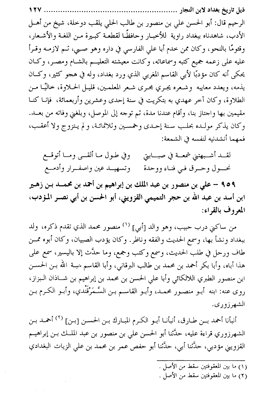 959- علي بن منصور بن عَبْدُ الْمَلِكِ بْنُ إِبْرَاهِيمَ بْنِ أَحْمَدَ بْنِ مُحَمَّد بْن زهير ابن أسد بن عبد الله بن حجر التميمي القزويني، أبو الحسن بن أبي نصر المؤدب، المعروف بالقراء: