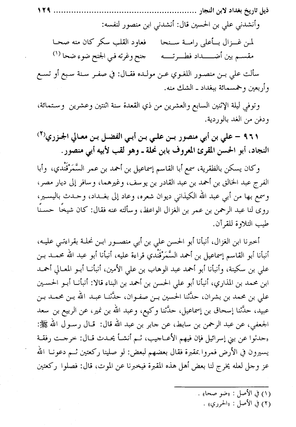 961- علي بن أبي منصور بن علي بن أبي الفضل بن معالي الجزري [2] النجاد، أبو الحسن المقرئ المعروف بابن نحلة- وهو لقب لأبيه أبي منصور.