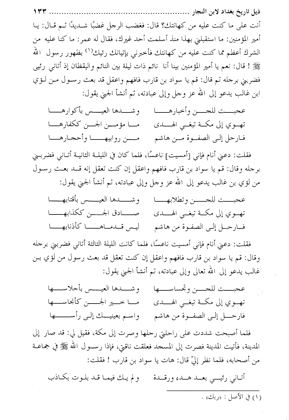 فقلت: دعني أنام فإني أمسيت ناعسا، فلما كانت الليلة الثالثة أتاني فضربني برجله وقال: قم يا سواد بن قارب فافهم واعقل إن كنت تعقل قد بعث رسول من لؤي بن غالب يدعو إلى الله تعالى وإلى عبادته، ثم أنشأ الجني يقول: