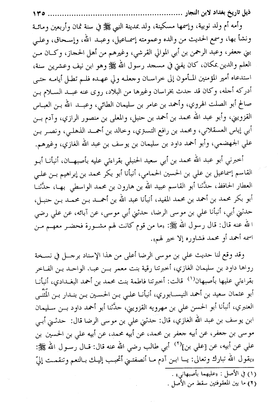وقد وقع لنا حديث علي بن موسى الرضا أعلى من هذا الإسناد برجل في نسخة رواها داود بن سليمان الغازي، أخبرتنا رقية بنت مَعْمَرِ بْنِ عَبْدِ الْوَاحِدِ بْنِ الْفَاخِرِ بِقِرَاءَتِي عليها بأصبهان [1] قالت: أخبرتنا فاطمة بنت محمد بن أحمد البغدادي، أنبأنا أبو عثمان سعيد بن أحمد النيسابوري، أنبأنا علي بن الحسين بن بندار بن المثنّى العنبري، أنبأنا أبو الحسن علي بن مهرويه القزويني، حدّثنا أبو أحمد داود بن سليمان ابن يوسف بن عبد الله الغازي، قال: حدثني علي بن موسى الرضا قال: حدثني أبي مُوسَى بْنِ جَعْفَرٍ، عَنْ أَبِيهِ جَعْفَرِ بْنِ مُحَمَّدٍ، عَنْ أَبِيهِ مُحَمَّدٍ، عَنْ أبيه عَلِيِّ بْنِ الْحُسَيْنِ بْنِ عَلِيٍّ عَنْ أَبِيهِ، عَنْ [عَلِيِّ بْنِ] [2] أَبِي طَالِبٍ رَضِيَ اللَّهُ عَنْهُ قَالَ: قَالَ رَسُولُ اللَّهِ صَلَّى اللَّهُ عَلَيْهِ وسلّم: «يقول الله تبارك وتعالى: يا ابن آدم ما أنصفتني أتحبب إليك بالنعم وتنقمت إليّ