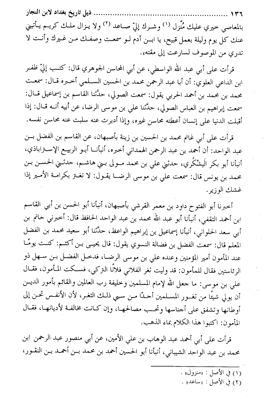 أَخْبَرَنَا أَبُو الْفُتُوحِ دَاوُدُ بْنُ مَعْمَرٍ الْقُرَشِيُّ بأصبهان، أنبأنا أبو الحسن بن أبي القاسم ابن أحمد الثقفي، أنبأنا أَبُو عَبْد اللَّه مُحَمَّد بْن عَبْد الواحد الحافظ قال: أخبرني حاتم بن أبي سعد الحلواني، أنبأنا إسماعيل بن إبراهيم الواعظ، حدّثنا أبو سعيد محمد بن الفضل المعلم قال: سمعت الفضل بن فضالة النسوي يقول: قال يحيى بن أكثم: كنت يوما عند المأمون أمير المؤمنين وعنده علي بن موسى الرضا، فدخل الفضل بن سهل ذو الرئاستين فقال للمأمون: قد وليت ثغر الفلاني فلانا التركي، فسكت المأمون، فقال علي بن موسى: ما جعل الله لإمام المسلمين وخليفة رب العالمين والقائم بأمور الدين أن يولي شيئا من ثغور المسلمين أحدا من سبي ذلك الثغر، لأن الأنفس تحن إلى أوطانها وتشفق على أجناسها وتحب مصالحها، وإن كانت مخالفة لأديانها، فقال المأمون: اكتبوا هذا الكلام بماء الذهب.