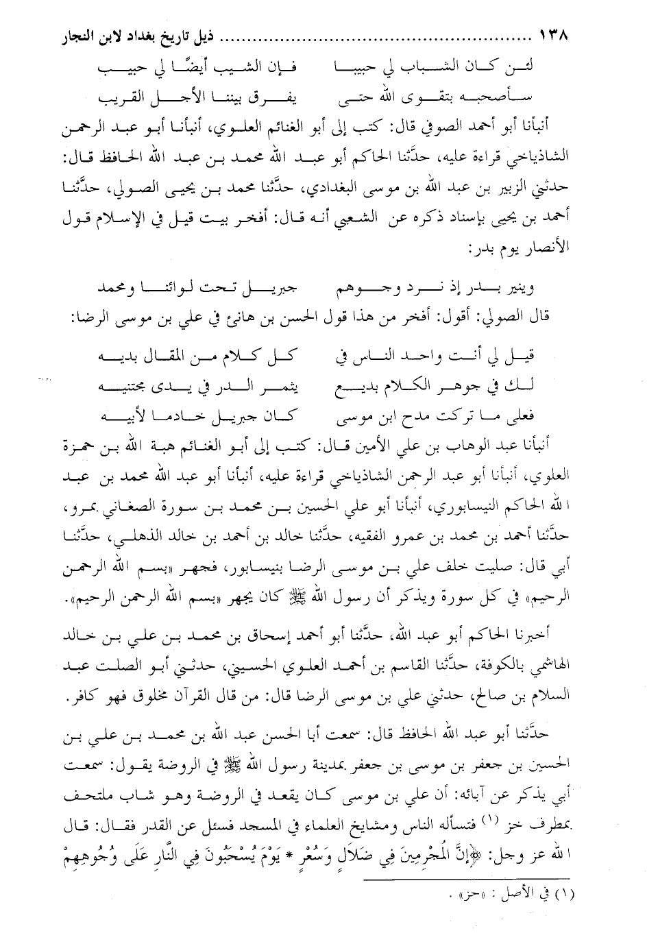 أنبأنا عبد الوهاب بن علي الأمين قال: كتب إلى أبو الغنائم هبة الله بن حمزة العلوي، أنبأنا أبو عبد الرحمن الشاذياخي قراءة عليه، أنبأنا أبو عبد الله محمد بن عبد الله الحاكم النيسابوري، أنبأنا أبو علي الحسين بن محمد بن سورة الصغاني بمرو، حدّثنا أحمد بن محمد بن عمرو الفقيه، حدّثنا خالد بن أحمد بن خالد الذهلي، حدّثنا أبي قال: صليت خلف علي بن موسى الرضا بنيسابور، فجهر «بسم الله الرحمن الرحيم» في كل سورة ويَذْكُرُ أَنَّ رَسُولَ اللَّهِ صَلَّى اللَّهُ عَلَيْهِ وَسَلَّمَ كان يجهر «بسم الله الرحمن الرحيم» .