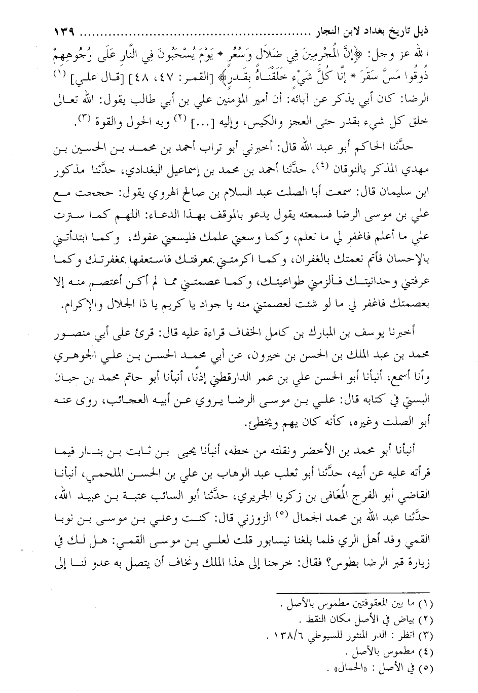 أنبأنا أبو محمد بن الأخضر ونقلته من خطه، أنبأنا يحيى بن ثابت بن بندار فيما قرأته عليه عن أبيه، حدّثنا أبو ثعلب عَبْد الوهاب بْن عَلِيّ بْن الْحَسَن الملحمي، أنبأنا الْقَاضِي أَبُو الْفَرَجِ الْمُعَافَى بْنُ زَكَرِيَّا الْجَرِيرِيُّ، حدّثنا أبو السائب عتبة بن عبيد الله، حدّثنا عبد الله بن محمد الجمال [5] الزوزني قال: كنت وعلي بن موسى بن نوبا القمي وفد أهل الري فلما بلغنا نيسابور قلت لعلي بن موسى القمي: هل لك في زيارة قبر الرضا بطوس؟ فقال: خرجنا إلى هذا الملك ونخاف أن يتصل به عدو لنا إلى