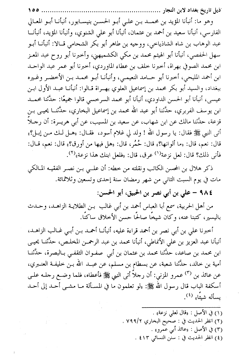 أخبرنا علي بن أبي نصر بن أحمد قراءة عليه، أنبأنا أحمد بن أبي غالب الزاهد، أنبأنا عبد العزيز بن علي الأنماطي، أنبأنا محمد بن عبد الرحمن المخلص، حدّثنا يحيى ابن محمد بن صاعد، حَدَّثَنَا مُحَمَّدُ بْنُ عُثْمَانَ بْنِ أَبِي صَفْوَانَ الثقفي بالبصرة، حدّثنا أمية بن خالد، حَدَّثَنَا شُعْبَةُ، عَنْ بِسْطَامِ بْنِ مُسْلِمٍ، عَنْ عبد الله بن خليفة العنبري، عن عائذ بن [3] عمرو المزني: أَنَّ رَجُلا أَتَى النَّبِيَّ صَلَّى اللَّهُ عَلَيْهِ وسلّم فأعطاه، فلما وضع رجله على أسكفة الباب قَالَ رَسُولُ اللَّهِ صَلَّى اللَّهُ عَلَيْهِ وَسَلَّمَ: «لو تعلمون ما في المسألة ما مشى أحد إلى أحد يسأله شيئا» [4] .