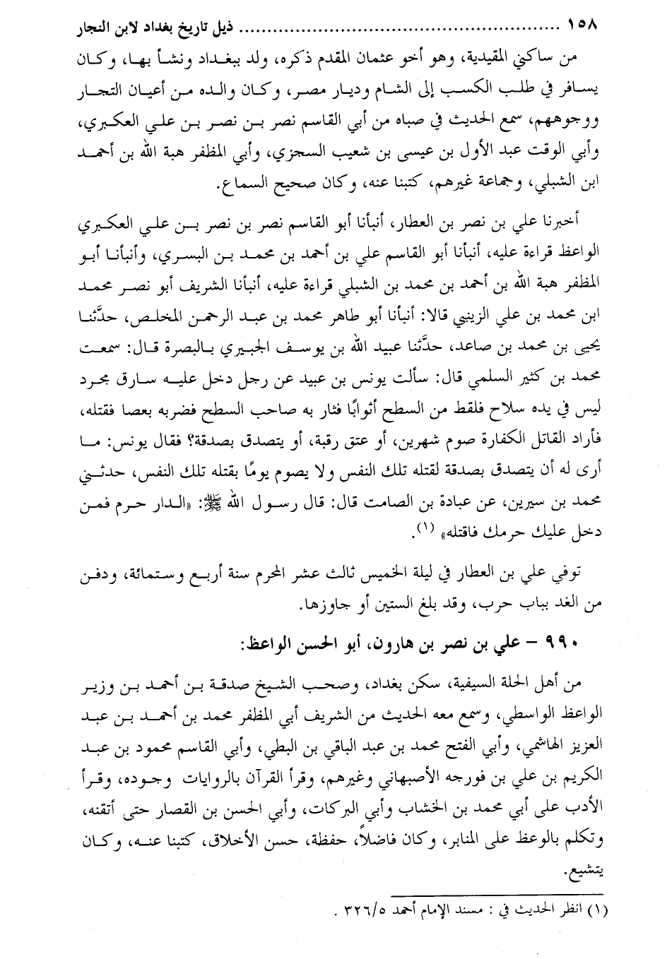 أخبرنا علي بن نصر بن العطار، أنبأنا أبو القاسم نصر بن نصر بن علي العكبري الواعظ قِرَاءَةً عَلَيْهِ، أَنْبَأَنَا أَبُو الْقَاسِمِ عَلِيُّ بْنُ أحمد بن محمد بن البسري، وأنبأنا أَبُو الْمُظَفَّرِ هِبَةُ اللَّهِ بْنُ أَحْمَدَ بْنِ مُحَمَّد بْن الشبلي قراءة عليه، أنبأنا الشريف أبو نصر محمد ابن محمد بن علي الزينبي قالا: أَنْبَأَنَا أَبُو طَاهِرٍ مُحَمَّدُ بْنُ عَبْدِ الرَّحْمَنِ الْمُخَلِّصُ، حدّثنا يحيى بن محمد بن صاعد، حدّثنا عبيد الله بن يوسف الجبيري بالبصرة قال: سمعت محمد بن كثير السلمي قال: سألت يونس بن عبيد عن رجل دخل عليه سارق مجرد ليس في يده سلاح فلقط من السطح أثوابا فثار به صاحب السطح فضربه بعصا فقتله، فأراد القاتل الكفارة صوم شهرين، أو عتق رقبة، أو يتصدق بصدقة؟ فقال يونس: ما أرى له أن يتصدق بصدقة لقتله تلك النفس ولا يصوم يوما بقتله تلك النفس، حدثني مُحَمَّدِ بْنِ سِيرِينَ، عَنْ عُبَادَةَ بْنِ الصَّامِتِ قَالَ: قَالَ رَسُولُ اللَّهِ صَلَّى اللَّهُ عَلَيْهِ وسلّم: «الدار حرم فمن دخل عليك حرمك فاقتله» [1] .