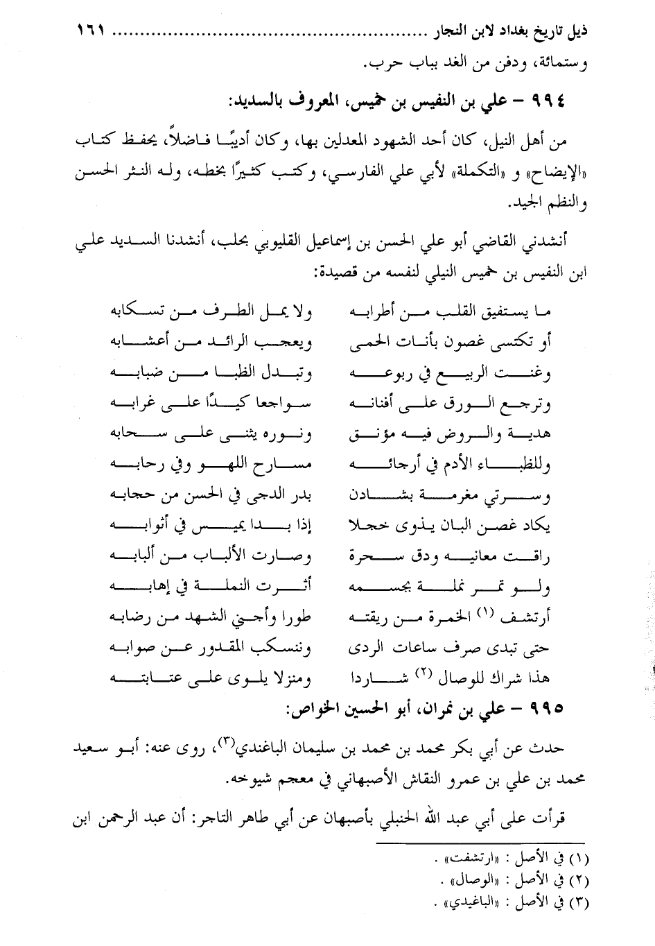 أنشدني القاضي أبو علي الحسن بن إسماعيل القليوبي بحلب، أنشدنا السديد علي ابن النفيس بن خميس النيلي لنفسه من قصيدة:
