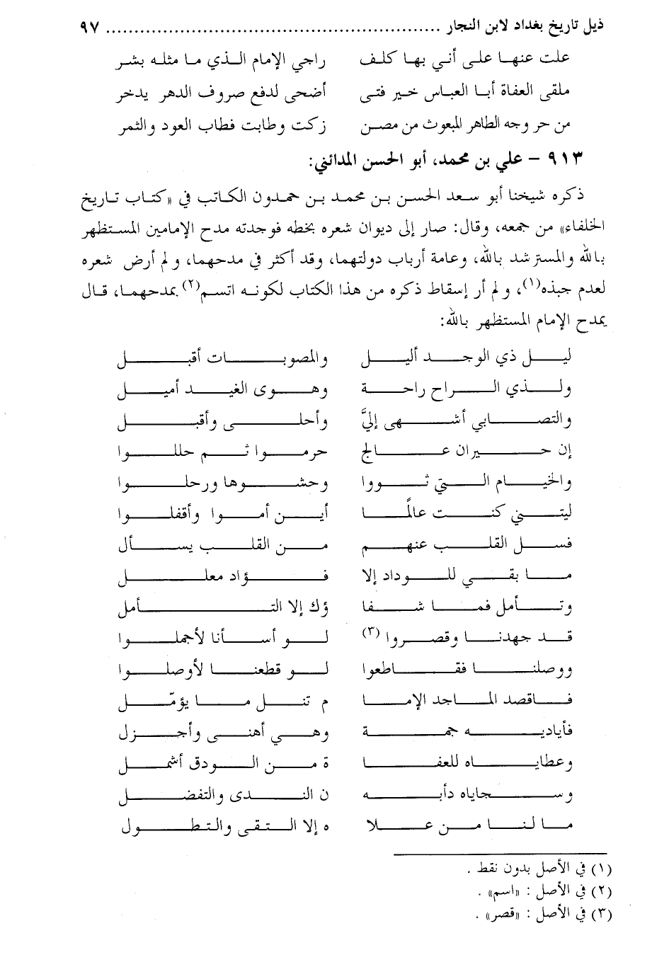 ذكره شيخنا أبو سعد الحسن بن مُحَمَّد بن حمدون الكاتب في «كتاب تاريخ الخلفاء» من جمعه، وقال: صار إلى ديوان شعره بخطه فوجدته مدح الإمامين المستظهر بالله والمسترشد بالله، وعامة أرباب دولتهما، وقد أكثر في مدحهما، ولم أرض شعره لعدم جبذه [1] ، ولم أر إسقاط ذكره من هذا الكتاب لكونه اتسم [2] بمدحهما، قال يمدح الإمام المستظهر بالله: