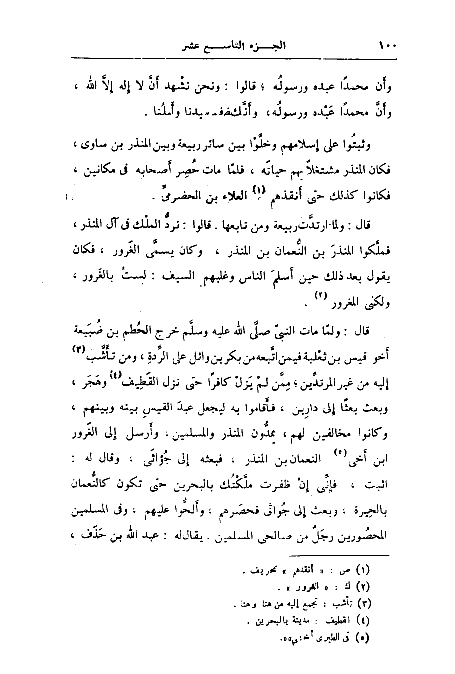 وثبتوا على إسلامهم وخلّوا بين سائر ربيعة وبين المنذر بن ساوى، فكان المنذر مشتغلا بهم حياته، فلمّا مات حصر أصحابه فى مكانين، فكانوا كذلك حتى أنقذهم [1] العلاء بن الحضرمىّ.