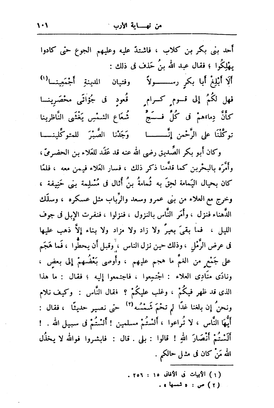 وكان أبو بكر الصّديق رضى الله عنه قد عقد للعلاء بن الحضرمىّ، وأمّره بالبحرين كما قدّمنا ذكر ذلك، فسار العلاء فيمن معه، فلمّا كان بحيال اليمامة لحق به ثمامة بن أثال فى مسلمة بنى حنيفة، وخرج مع العلاء من بنى عمرو وسعد والرّباب مثل عسكره، وسلك الدّهناء فنزل، وأمر النّاس بالنزول، فنزلوا، فنفرت الإبل فى جوف الليل، فما بقى بعير ولا زاد ولا مزاد ولا بناء إلّا ذهب عليها فى عرض الرّمل، وذلك حين نزل الناس، وقبل أن يحطّوا، فما هجم على جمع من الغمّ ما هجم عليهم، وأوصى بعضهم إلى بعض، ونادى منادى العلاء: اجتمعوا، فاجتمعوا إليه؛ فقال: ما هذا الذى قد ظهر فيكم، وغلب عليكم؟ فقال النّاس: وكيف نلام ونحن إن بلغنا غدا لم تحم شمسه [2] حتى نصير حديثا، فقال: