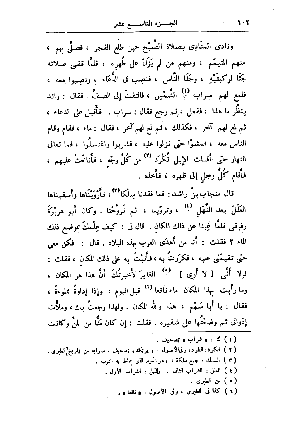 ونادى المنادى بصلاة الصّبح حين طلع الفجر، فصلّى بهم، منهم المتيمّم، ومنهم من لم يزل على طهره، فلمّا قضى صلاته جثا لركبتيه، وجثا النّاس، فنصب فى الدّعاء، ونصبوا معه، فلمع لهم سراب [1] الشّمس، فالتفت إلى الصفّ. فقال: رائد ينظر ما هذا، ففعل، ثم رجع فقال: سراب. فأقبل على الدعاء، ثم لمع لهم آخر، فكذلك، ثم لمع لهم آخر، فقال: ماء، فقام وقام الناس معه، فمشوا حتى نزلوا عليه، فشربوا واغتسلوا، فما تعالى النهار حتى أقبلت الإبل تكرد [2] من كلّ وجه، فأناخت عليهم، فأقام كلّ رجل إلى ظهره، فأخذه.