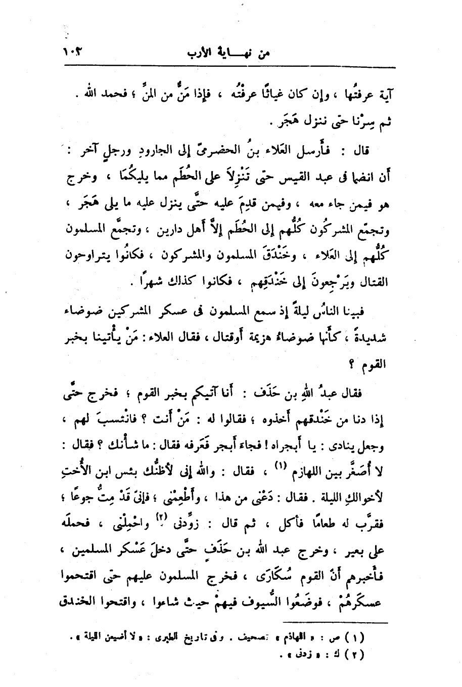 لا أصغّر بين اللهازم [1] ، فقال: والله إنى لأظنّك بئس ابن الأخت لأخوالك الليلة. فقال: دعنى من هذا، وأطعمنى؛ فإنّى قد متّ جوعا؛ فقرّب له طعاما فأكل، ثم قال: زوّدنى [2] واحملنى، فحمله على بعير، وخرج عبد الله بن حذف حتّى دخل عسكر المسلمين، فأخبرهم أنّ القوم سكارى، فخرج المسلمون عليهم حتى اقتحموا عسكرهم، فوضعوا السّيوف فيهم حيث شاءوا، واقتحوا الخندق