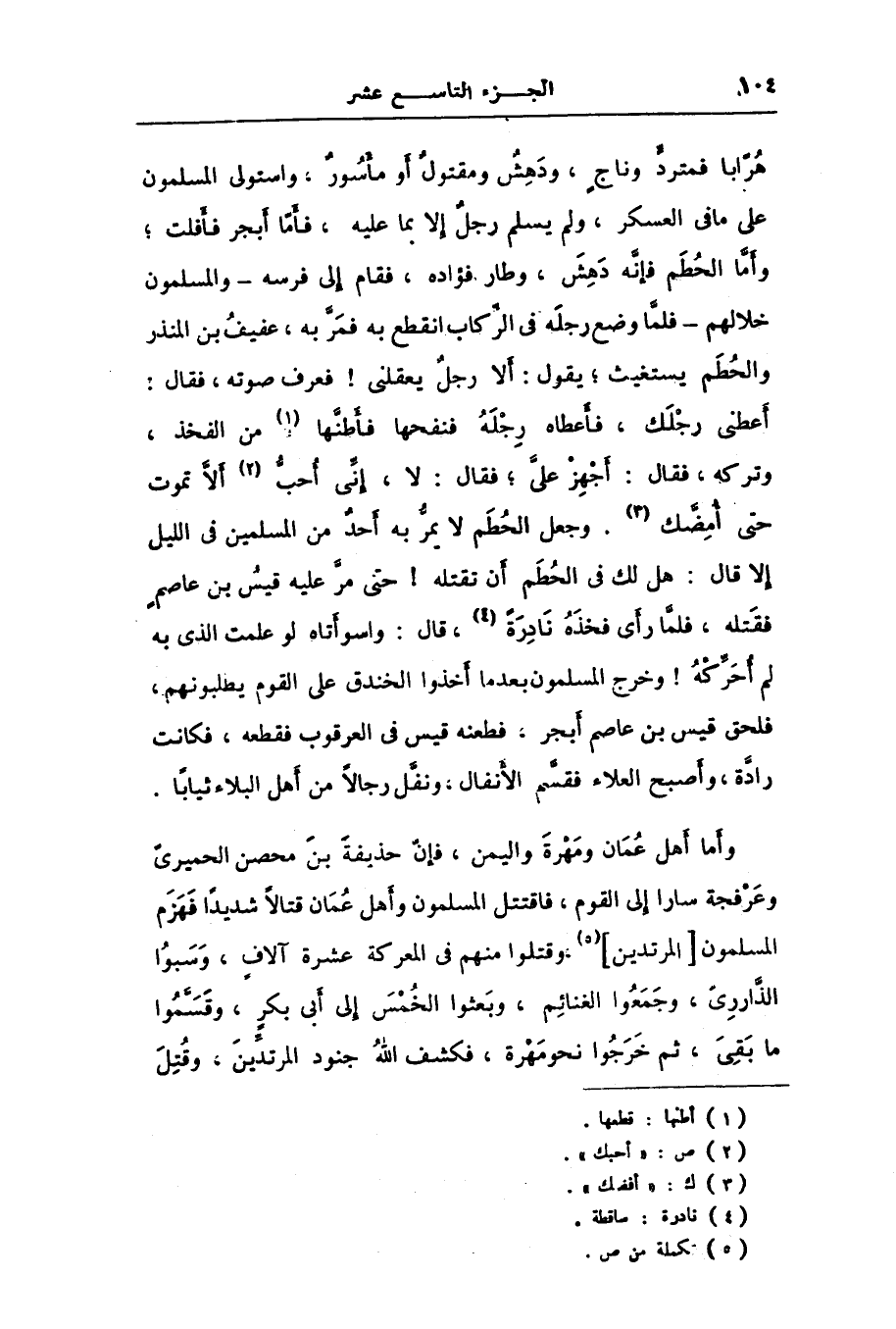أعطنى رجلك، فأعطاه رجله فنفحها فأطنّها [1] من الفخذ، وتركه، فقال: أجهز علىّ؛ فقال: لا، إنّى أحبّ [2] ألّا تموت حتى أمضّك [3] . وجعل الحطم لا يمرّ به أحد من المسلمين فى الليل إلا قال: هل لك فى الحطم أن تقتله! حتى مرّ عليه قيس بن عاصم فقتله، فلمّا رأى فخذه نادرة [4] ، قال: وا سوأتاه لو علمت الذى به لم أحرّكه! وخرج المسلمون بعد ما أخذوا الخندق على القوم يطلبونهم، فلحق قيس بن عاصم أبجر، فطعنه قيس فى العرقوب فقطعه، فكانت رادّة، وأصبح العلاء فقسّم الأنفال، ونفّل رجالا من أهل البلاء ثيابا.