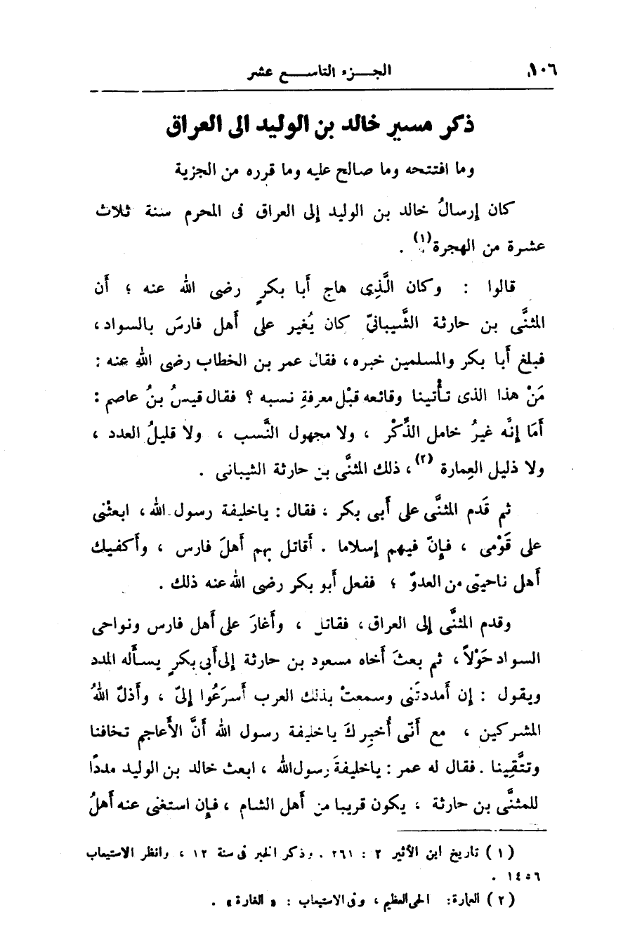 وقدم المثنّى إلى العراق، فقاتل، وأغار على أهل فارس ونواحى السواد حولا، ثم بعث أخاه مسعود بن حارثة إلى أبى بكر يسأله المدد ويقول: إن أمددتنى وسمعت بذلك العرب أسرعوا إلىّ، وأذلّ الله المشركين، مع أنّى أخبرك يا خليفة رسول الله أنّ الأعاجم تخافنا وتتّقينا. فقال له عمر: يا خليفة رسول الله، ابعث خالد بن الوليد مددا للمثنّى بن حارثة، يكون قريبا من أهل الشام، فإن استغنى عنه أهل