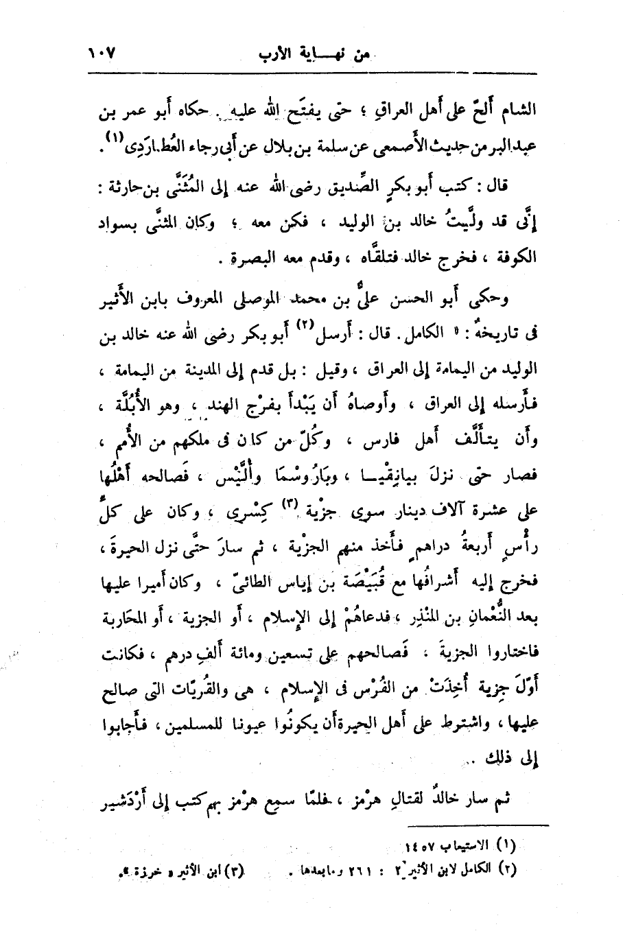 وحكى أبو الحسن علىّ بن محمد الموصلى المعروف بابن الأثير فى تاريخه: «الكامل. قال: أرسل [2] أبو بكر رضى الله عنه خالد بن الوليد من اليمامة إلى العراق، وقيل: بل قدم إلى المدينة من اليمامة، فأرسله إلى العراق، وأوصاه أن يبدأ بفرج الهند، وهو الأبلّة، وأن يتألّف أهل فارس، وكلّ من كان فى ملكهم من الأمم، فصار حتى نزل بيانقيا، وباروسما وألّيس، فصالحه أهلها على عشرة آلاف دينار سوى جزية [3] كسرى، وكان على كلّ رأس أربعة دراهم فأخذ منهم الجزية، ثم سار حتّى نزل الحيرة، فخرج إليه أشرافها مع قبيصة بن إياس الطائىّ، وكان أميرا عليها بعد النّعمان بن المنذر، فدعاهم إلى الإسلام، أو الجزية، أو المحاربة فاختاروا الجزية، فصالحهم على تسعين ومائة ألف درهم، فكانت أوّل جزية أخذت من الفرس فى الإسلام، هى والقريّات التى صالح عليها، واشترط على أهل الحيرة أن يكونوا عيونا للمسلمين، فأجابوا إلى ذلك.