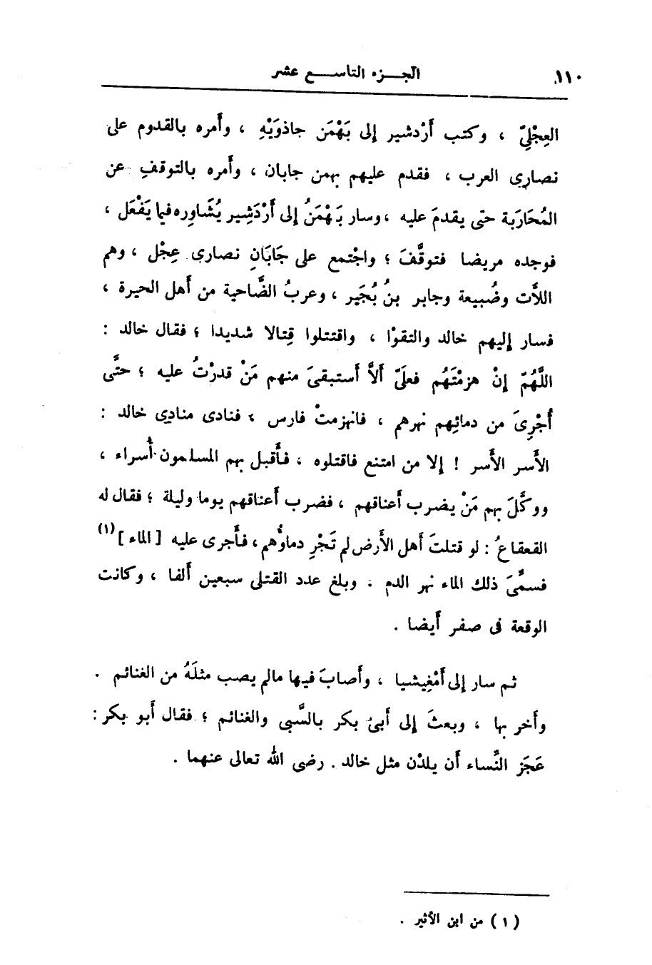 الأسر الأسر! إلا من امتنع فاقتلوه، فأقبل بهم المسلمون أسراء، ووكّل بهم من يضرب أعناقهم، فضرب أعناقهم يوما وليلة؛ فقال له القعقاع: لو قتلت أهل الأرض لم تجر دماؤهم، فأجرى عليه [الماء] [1] فسمّى ذلك الماء نهر الدم، وبلغ عدد القتلى سبعين ألفا، وكانت الوقعة فى صفر أيضا.