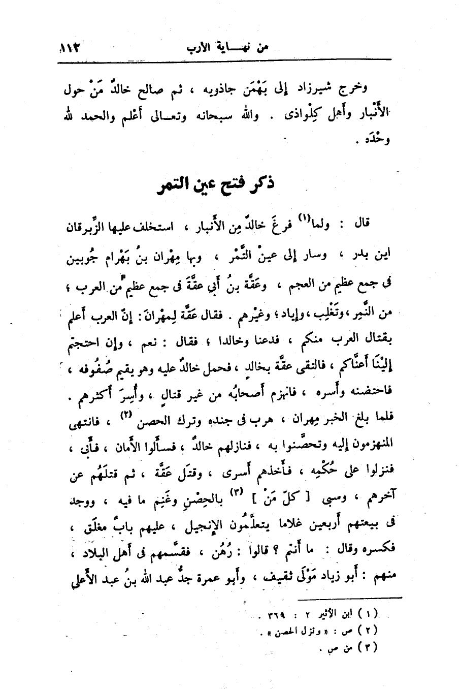قال: ولما [1] فرغ خالد من الأنبار، استخلف عليها الزّبرقان اين بدر، وسار إلى عين التّمر، وبها مهران بن بهرام جوبين فى جمع عظيم من العجم، وعقّة بن أبى عقّة فى جمع عظيم من العرب؛ من النّمر، وتغلب، وإياد؛ وغيرهم. فقال عقّة لمهران: إنّ العرب أعلم بقتال العرب منكم، فدعنا وخالدا؛ فقال: نعم، وإن احتجتم إلينا أعنّاكم، فالتقى عقّة بخالد، فحمل خالد عليه وهو يقيم صفوفه، فاحتضنه وأسره، فانهزم أصحابه من غير قتال، وأسر أكثرهم.