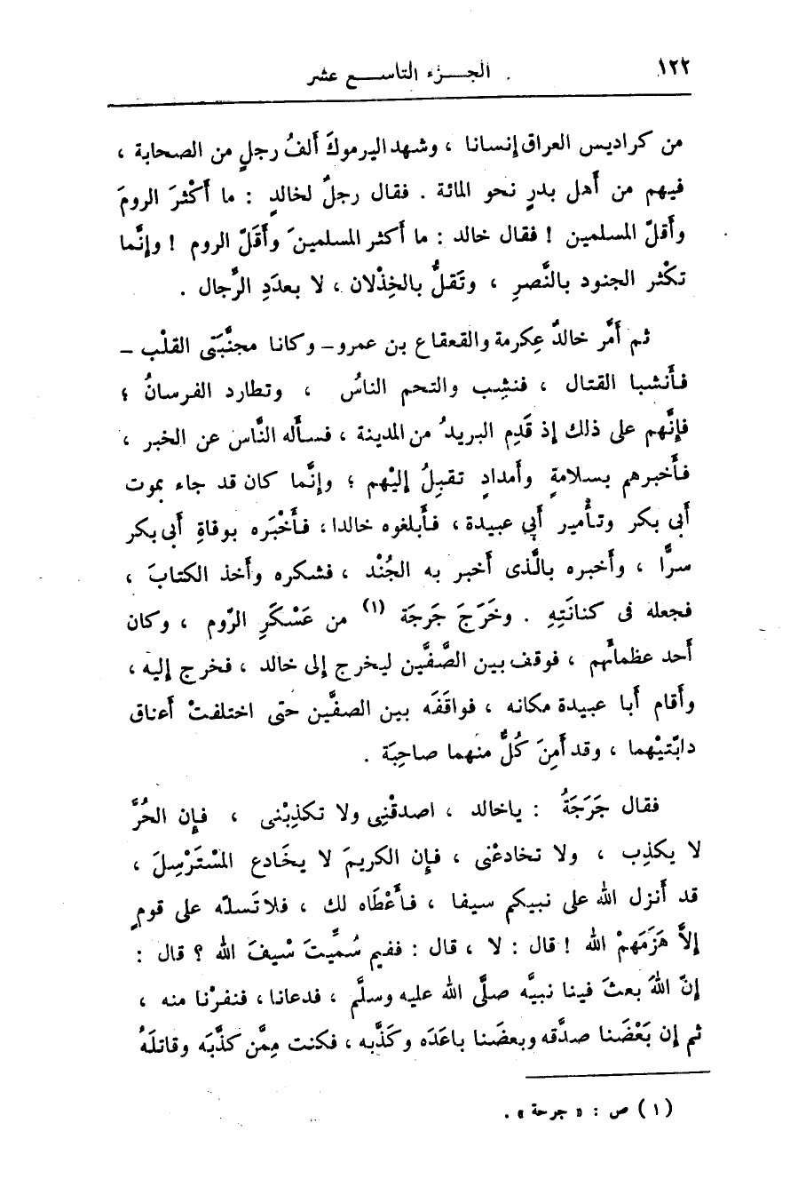 فقال جرجة: يا خالد، اصدقنى ولا تكذبنى، فإن الحرّ لا يكذب، ولا تخادعنى، فإن الكريم لا يخادع المسترسل، قد أنزل الله على نبيكم سيفا، فأعطاه لك، فلا تسلّه على قوم إلّا هزمهم الله! قال: لا، قال: ففيم سمّيت سيف الله؟ قال: