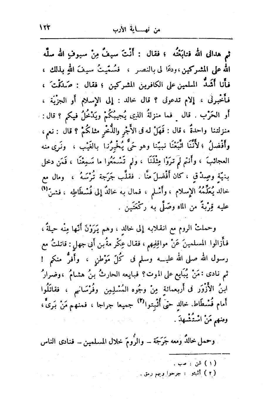 ثم هدانى الله فتابعته؛ فقال: أنت سيف من سيوف الله سلّه الله على المشركين، ودعا لى بالنصر، فسمّيت سيف الله بذلك، فأنا أشدّ المسلمين على الكافرين المشركين؛ فقال: صدقت، فأخبرنى، إلام تدعونى؟ قال خالد: إلى الإسلام أو الجزية، أو الحرب. قال فما منزلة الذى يجيبكم ويدخل فيكم؟ قال: