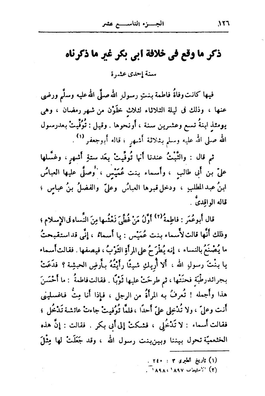 فيها كانت وفاة فاطمة بنت رسول الله صلّى الله عليه وسلّم ورضى عنها، وذلك فى ليلة الثلاثاء لثلاث خلون من شهر رمضان، وهى يومئذ ابنة تسع وعشرين سنة، أو نحوها. وقيل: توفّيت بعد رسول الله صلى الله عليه وسلّم بثلاثة أشهر؛ قاله أبو جعفر [1] .
