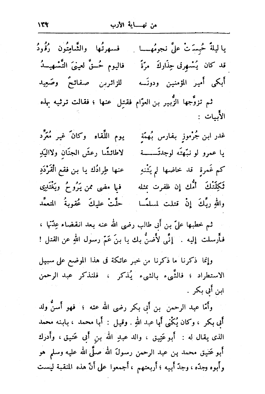 ثم خطبها علىّ بن أبى طالب رضى الله عنه بعد انقضاء عدّتها، فأرسلت إليه. إنّى لأضنّ بك يا بن عمّ رسول الله عن القتل! وإنما ذكرنا ما ذكرنا من خبر عاتكة فى هذا الموضع على سبيل الاستطراد؛ فالشّىء بالشىء يذكر، فلنذكر عبد الرحمن ابن أبى بكر.
