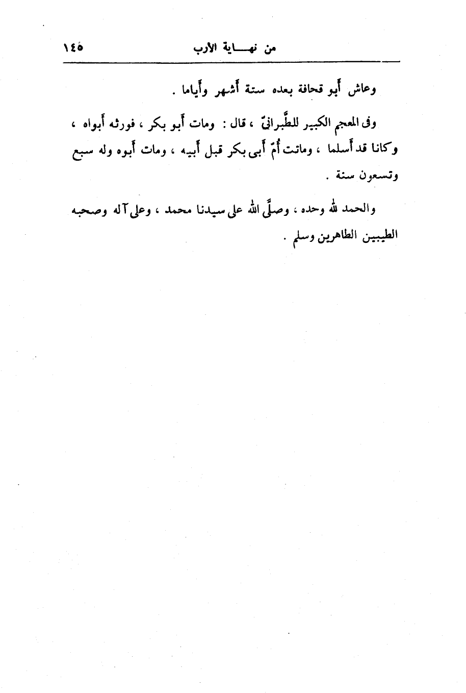 وفى المعجم الكبير للطّبرانىّ، قال: ومات أبو بكر، فورثه أبواه، وكانا قد أسلما، وماتت أمّ أبى بكر قبل أبيه، ومات أبوه وله سبع وتسعون سنة.