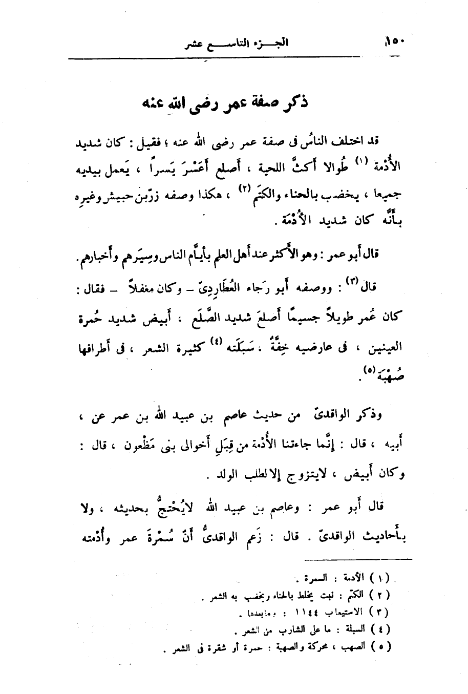 قد اختلف الناس فى صفة عمر رضى الله عنه؛ فقيل: كان شديد الأدمة [1] طوالا أكثّ اللحية، أصلع أعسر يسرا، يعمل بيديه جميعا، يخضب بالحناء والكتم [2] ، هكذا وصفه زرّ بن حبيش وغيره بأنّه كان شديد الأدمة.