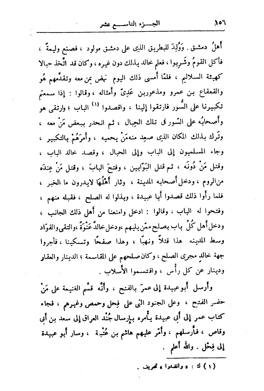 أهل دمشق. وولد للبطريق الذى على دمشق مولود، فصنع وليمة، فأكل القوم وشربوا، فعلم خالد بذلك دون غيره، وكان قد اتّخذ حبالا كهيئة السلاليم، فلمّا أمسى ذلك اليوم نهض بمن معه وتقدّمهم هو والقعقاع بن عمرو ومذعور بن عدىّ وأمثاله، وقالوا: إذا سمعتم تكبيرنا على السّور فارتقوا إلينا، واقصدوا [1] الباب؛ وارتقى هو وأصحابه على السّور فى تلك الحبال، ثم انحدر ببعض من معه، وترك بذلك المكان الذى صعد منه من يحميه، وأمرهم بالتكبير، وجاء المسلميون إلى الباب وإلى الحبال، وقصد خالد الباب، وقتل من دونه، ثم قتل البوّابين، وفتح الباب، وقتل من عنده من الروم، ودخل أصحابه المدينة، وثار أهلها لا يدرون ما الخبر، فلما رأوا ذلك قصدوا أبا عبيدة، وبذلوا له الصلح، فقبله منهم، وفتحوا له الباب، وقالوا: ادخل وامنعنا من أهل ذلك الجانب، ودخل أهل كلّ باب بصلح ممّن يليهم، ودخل خالد عنوة، والتقى والقوّاد وسط المدينه هذا قتلا ونهبا، وهذا صفحا وتسكينا، فأجروا جهة خالد مجرى الصلح، وكان صلحهم على المقاسمة؛ الدينار والعقار ودينار عن كل رأس، واقتسموا الأسلاب.