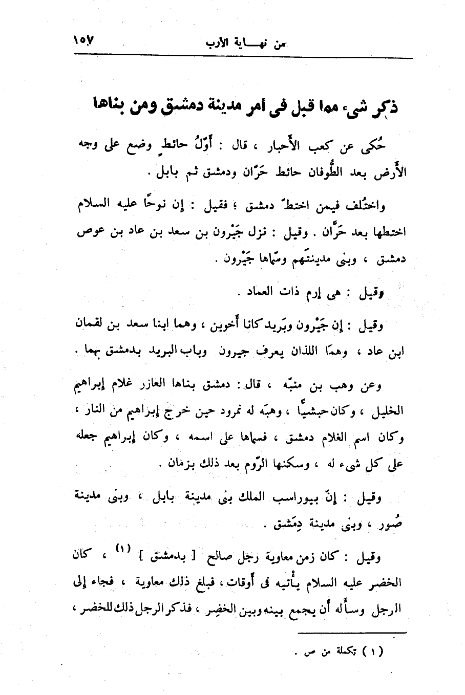 وعن وهب بن منبّه، قال: دمشق بناها العازر غلام إبراهيم الخليل، وكان حبشيّا، وهبه له نمرود حين خرج إبراهيم من النار، وكان اسم الغلام دمشق، فسماها على اسمه، وكان إبراهيم جعله على كل شىء له، وسكنها الرّوم بعد ذلك بزمان.