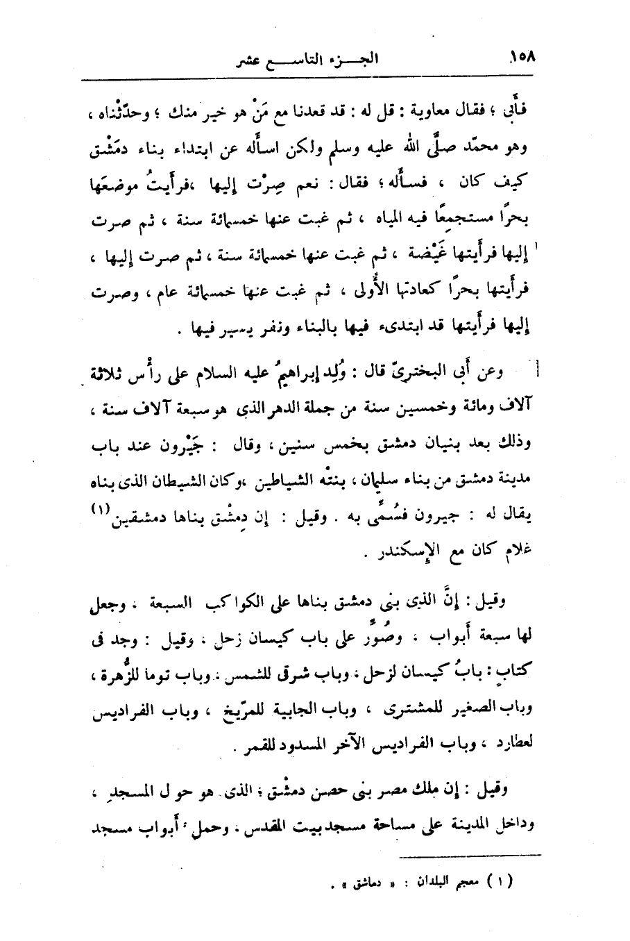 وعن أبى البخترىّ قال: ولد إبراهيم عليه السلام على رأس ثلاثة آلاف ومائة وخمسين سنة من جملة الدهر الذى هو سبعة آلاف سنة، وذلك بعد بنيان دمشق بخمس سنين، وقال: جيرون عند باب مدينة دمشق من بناء سليمان، بنته الشياطين، وكان الشيطان الذى بناه يقال له: جيرون فسمّى به. وقيل: إن دمشق بناها دمشقين [1] غلام كان مع الإسكندر.
