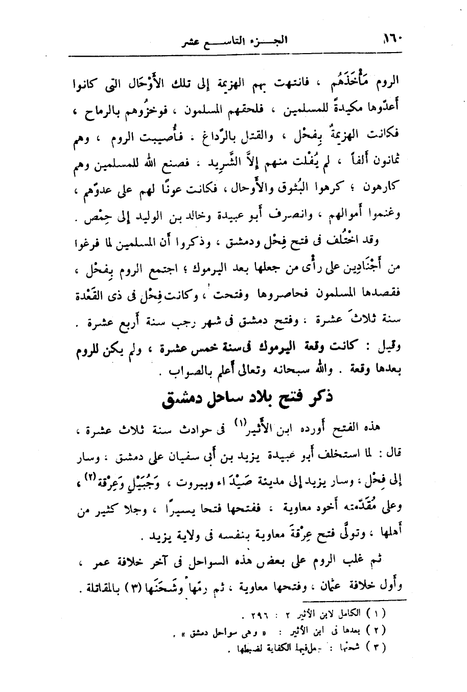 وقد اختلف فى فتح فحل ودمشق، وذكروا أن المسلمين لما فرغوا من أجنادين على رأى من جعلها بعد اليرموك؛ اجتمع الروم بفحل، فقصدها المسلمون فحاصروها وفتحت، وكانت فحل فى ذى القعدة سنة ثلاث عشرة، وفتح دمشق فى شهر رجب سنة أربع عشرة.