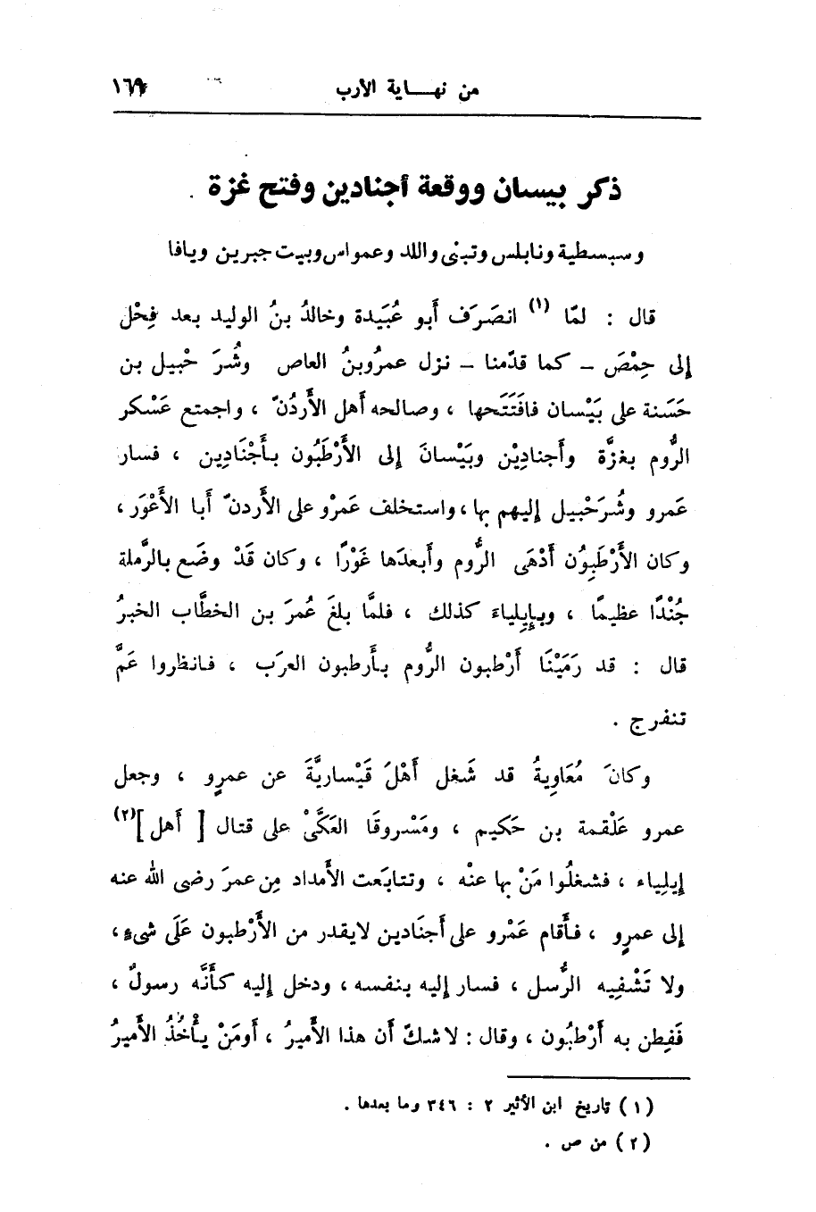 وسبسطية ونابلس وتبنى واللد وعمواس وبيت جبرين ويافا قال: لمّا [1] انصرف أبو عبيدة وخالد بن الوليد بعد فحل إلى حمص- كما قدّمنا- نزل عمرو بن العاص وشرحبيل بن حسنة على بيسان فافتتحها، وصالحه أهل الأردنّ، واجتمع عسكر الرّوم بعزّة وأجنادين وبيسان إلى الأرطبون بأجنادين، فسار عمرو وشرحبيل إليهم بها، واستخلف عمرو على الأردنّ أبا الأعور، وكان الأرطبون أدهى الرّوم وأبعدها غورا، وكان قد وضع بالرّملة جندا عظيما، وبإيلياء كذلك، فلمّا بلغ عمر بن الخطّاب الخبر قال: قد رمينا أرطبون الرّوم بأرطبون العرب، فانظروا عمّ تنفرج.