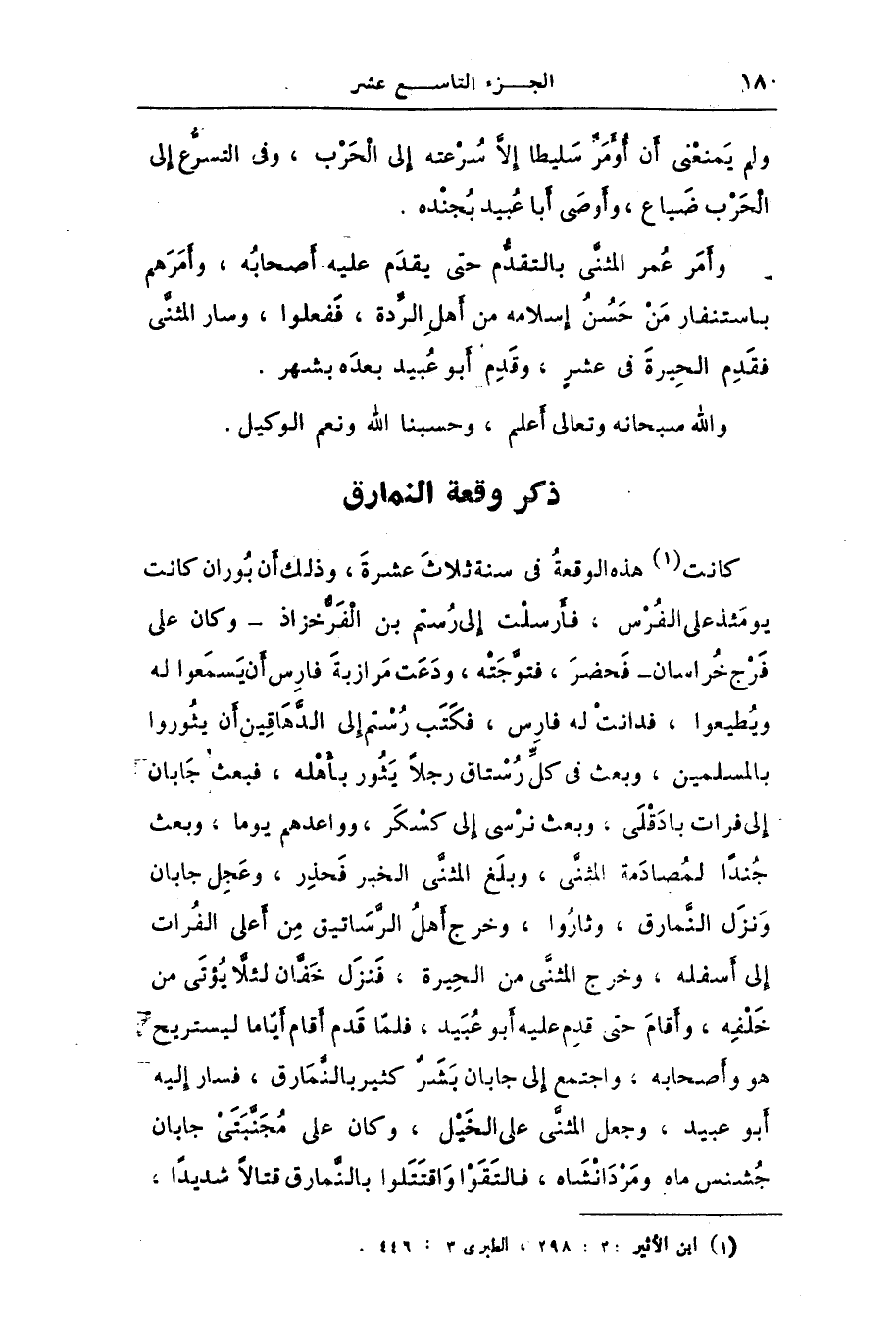 كانت [1] هذه الوقعة فى سنة ثلاث عشرة، وذلك أن بوران كانت يومئذ على الفرس، فأرسلت إلى رستم بن الفرّخزاذ- وكان على فرج خراسان- فحضر، فتوّجته، ودعت مرازبة فارس أن يسمعوا له ويطيعوا، فدانت له فارس، فكتب رستم إلى الدّهاقين أن يثوروا بالمسلمين، وبعث فى كلّ رستاق رجلا يثور بأهله، فبعث جابان إلى فرات بادقلى، وبعث نرسى إلى كسكر، وواعدهم يوما، وبعث جندا لمصادمة المثنّى، وبلغ المثنّى الخبر فحذر، وعجل جابان ونزل النّمارق، وثاروا، وخرج أهل الرّساتيق من أعلى الفرات إلى أسفله، وخرج المثنّى من الحيرة، فنزل خفّان لئلّا يؤتى من خلفه، وأقام حتى قدم عليه أبو عبيد، فلمّا قدم أقام أيّاما ليستريح هو وأصحابه، واجتمع إلى جابان بشر كثير بالنّمارق، فسار إليه أبو عبيد، وجعل المثنّى على الخيل، وكان على مجنّبتى جابان جشنس ماه ومردانشاه، فالتقوا واقتتلوا بالنّمارق قتالا شديدا،