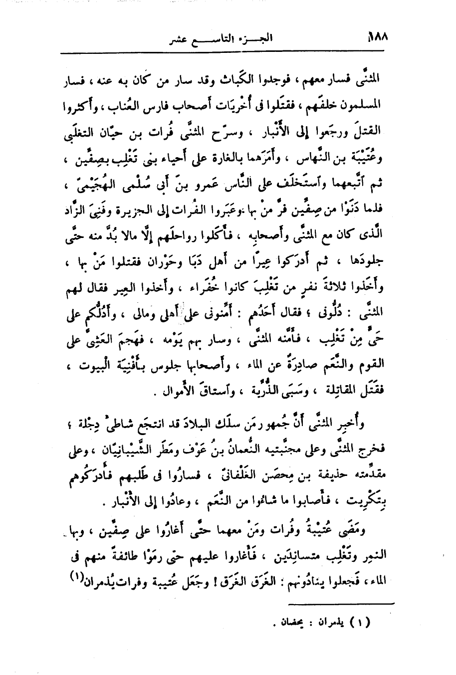 ومضى عتيبة وفرات ومن معهما حتّى أغاروا على صفّين، وبها النمر وتغلب متساندين، فأغاروا عليهم حتى رموا طائفة منهم فى الماء، فجعلوا ينادونهم: الغرق الغرق! وجعل عتيبة وفرات يذمران [1]