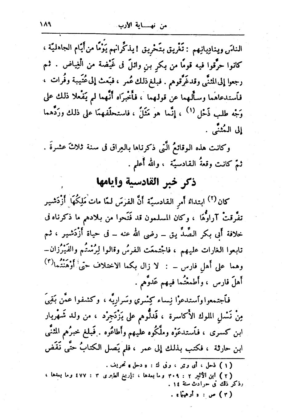 [2] ابن الأثير 2: 309 وما بعدها، تاريخ الطبرى 3: 477 وما بعدها، وذكر ذلك فى حوادث سنة 14.