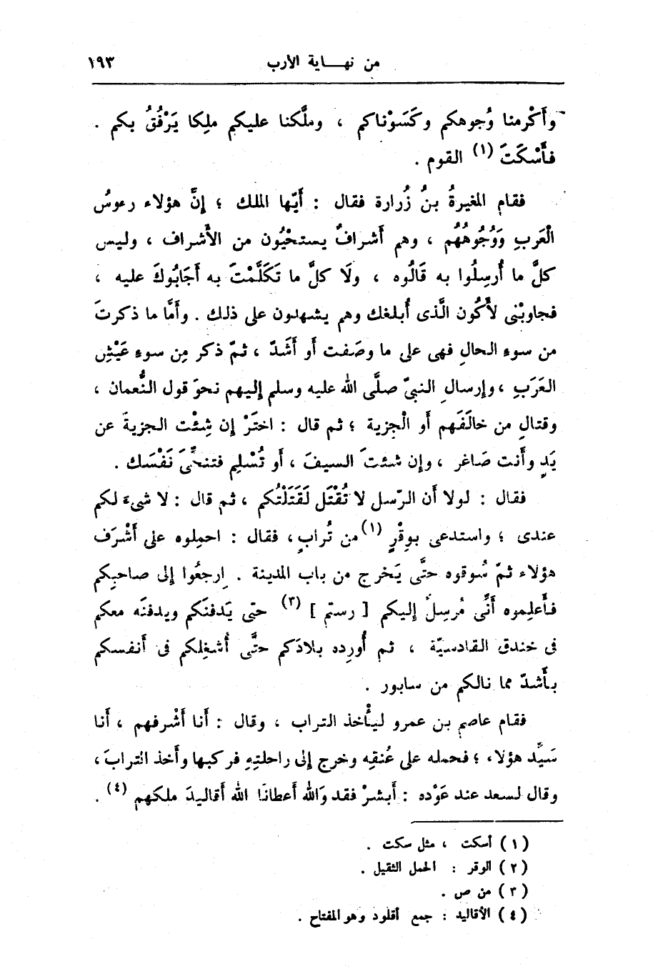 فقام المغيرة بن زرارة فقال: أيّها الملك؛ إنّ هؤلاء رءوس العرب ووجوههم، وهم أشراف يستحيون من الأشراف، وليس كلّ ما أرسلوا به قالوه، ولا كلّ ما تكلّمت به أجابوك عليه، فجاوبنى لأكون الّذى أبلغك وهم يشهدون على ذلك. وأمّا ما ذكرت من سوء الحال فهى على ما وصفت أو أشدّ، ثمّ ذكر من سوء عيش العرب، وإرسال النبىّ صلّى الله عليه وسلم إليهم نحو قول النّعمان، وقتال من خالفهم أو الجزية؛ ثم قال: اختر إن شئت الجزية عن يد وأنت صاغر، وإن شئت السيف، أو تسلم فتنحّى نفسك.