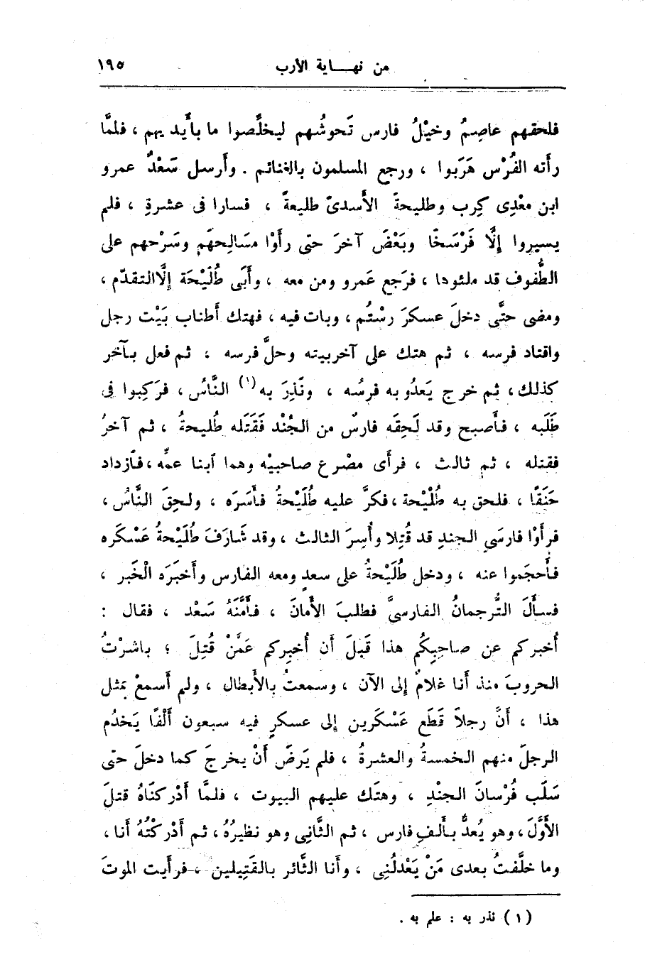 فلحقهم عاصم وخيل فارس تحوشهم ليخلّصوا ما بأيديهم، فلمّا رأته الفرس هربوا، ورجع المسلمون بالغنائم. وأرسل سعد عمرو ابن معدى كرب وطليحة الأسدىّ طليعة، فسارا فى عشرة، فلم يسيروا إلّا فرسخا وبعض آخر حتى رأوا مسالحهم وسرحهم على الطّفوف قد ملئوها، فرجع عمرو ومن معه، وأبى طليحة إلّا التقدّم، ومضى حتّى دخل عسكر رستم، وبات فيه، فهتك أطناب بيت رجل واقتاد فرسه، ثم هتك على آخر بيته وحلّ فرسه، ثم فعل بآخر كذلك، ثم خرج يعدو به فرسه، ونذر به [1] النّاس، فركبوا فى طلبه، فأصبح وقد لحقه فارس من الجند فقتله طليحة، ثم آخر فقتله، ثم ثالث، فرأى مصرع صاحبيه وهما أبنا عمّه، فازداد حنقا، فلحق به طليحة، فكرّ عليه طليحة فأسره، ولحق النّاس، فرأوا فارسى الجند قد قتلا وأسر الثالث، وقد شارف طليحة عسكره فأحجموا عنه، ودخل طليحة على سعد ومعه الفارس وأخبره الخبر، فسأل التّرجمان الفارسىّ فطلب الأمان، فأمّنه سعد، فقال: