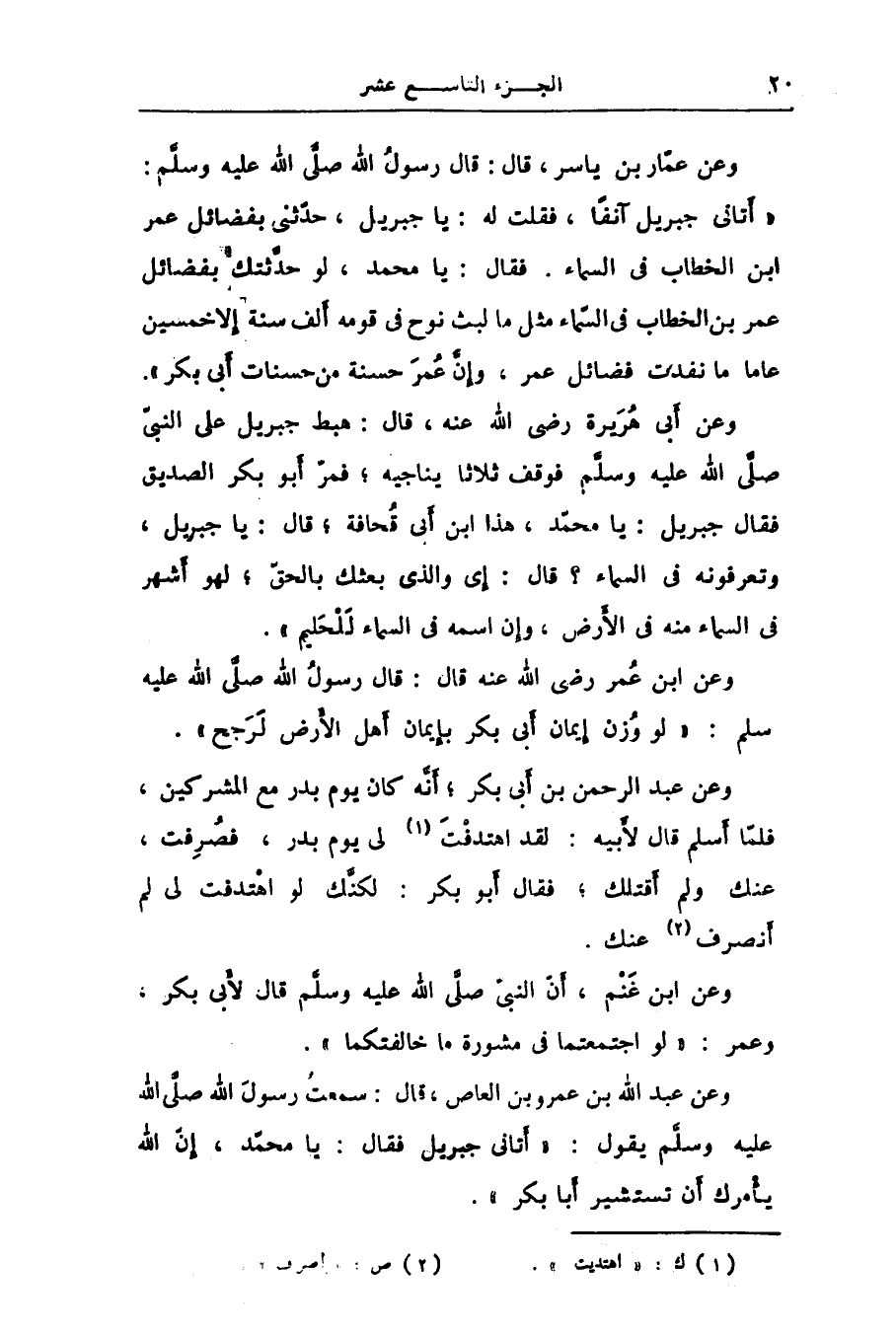 وعن عمّار بن ياسر، قال: قال رسول الله صلّى الله عليه وسلّم: «أتانى جبريل آنفا، فقلت له: يا جبريل، حدّثنى بفضائل عمر ابن الخطاب فى السماء. فقال: يا محمد، لو حدّثتك بفضائل عمر بن الخطاب فى السّماء مثل ما لبث نوح فى قومه ألف سنة إلا خمسين عاما ما نفدت فضائل عمر، وإنّ عمر حسنة من حسنات أبى بكر»