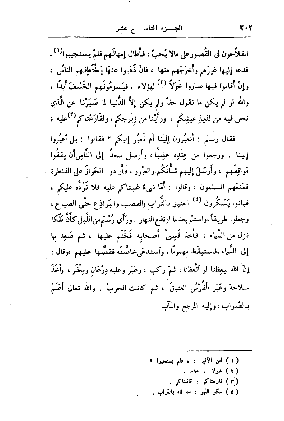 الفلّاحون فى القصور على ما لا يحبّ، فأطال إمهالهم فلم يستجيبوا [1] ، فدعا إليها غيرهم وأخرجهم منها، فان ذهبوا عنها يختطفهم الناس، وإن أقاموا فيها صاروا خولا [2] لهؤلاء، فيسومونهم الخسف أبدا، والله لو لم يكن ما نقول حقا ولم يكن إلّا الدّنيا لما صبرنا عن الّذى نحن فيه من لذيذ عيشكم، ورأينا من زبرجكم، ولقارعناكم [3] عليه؛ فقال رستم: أتعبرون إلينا أم نعبر إليكم؟ فقالوا: بل أعبروا إلينا. ورجعوا من عنده عشيّا، وأرسل سعد إلى النّاس أن يقفوا مواقفهم، وأرسل إليهم شأنكم والعبور، فأرادوا الجواز على القنطرة فمنعهم المسلمون، وقالوا: أمّا شىء غلبناكم عليه فلا نردّه عليكم، فباتوا يسكرون [4] العتيق بالتّراب والقصب والبراذع حتّى الصباح، وجعلوا طريقا، واستتم بعد ما ارتفع النهار. ورأى رستم من اللّيل كأنّ ملكا نزل من السّماء، فأخذ قسىّ أصحابه فختم عليها، ثم صعد بها إلى السّماء، فاستيقظ مهموما، واستدعى خاصّته فقصّها عليهم، وقال: