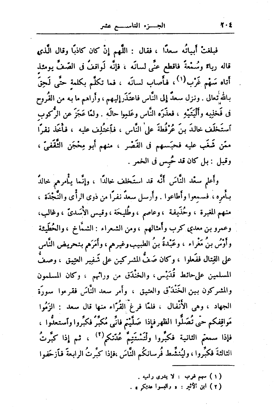 وأعلم سعد النّاس أنّه قد استخلف خالدا، وإنّما يأمرهم خالد بأمره، فسمعوا وأطاعوا. وأرسل سعد نفرا من ذوى الرأى والنّجدة، منهم المغبرة، وحذيفة، وعاصم، وطليحة، وقيس الأسدىّ، وغالب، وعمرو بن معدى كرب وأمثالهم، ومن الشعراء: الشمّاخ، والحطيئة وأوس بن معراء، وعبدة بن الطبيب وغيرهم، وأمرهم بتحريض النّاس على القتال ففعلوا، وكان صفّ المشركين على شفير العتيق، وصفّ المسلمين على حائط قديس، والخندق من ورائهم، وكان المسلمون والمشركون بين الخندق والعتيق، وأمر سعد النّاس فقرءوا سورة الجهاد، وهى الأنفال، فلمّا فرغ القرّاء منها قال سعد: الزموا مواقفكم حتى تصلّوا الظهر فإذا صلّيتم فانّى مكبّر فكبّروا واستعدّوا، فإذا سمعتم الثانية فكبّروا ولتستتمّ عدّتكم [2] ، ثم إذا كبّرت الثالثة فكبّروا، ولينشّط فرسانكم النّاس، فإذا كبّرت الرابعة فازحفوا