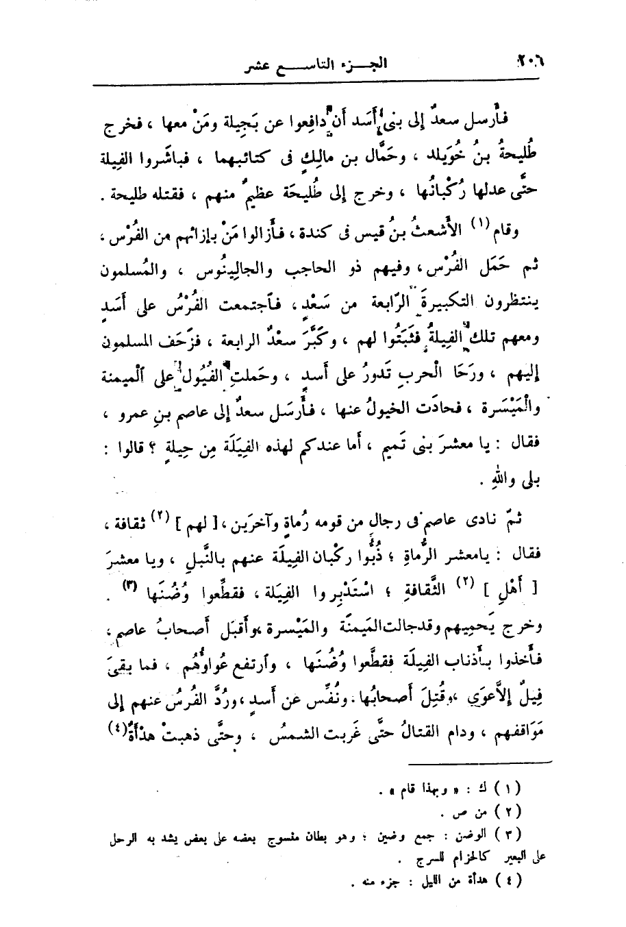 وقام [1] الأشعث بن قيس فى كندة، فأزالوا من بإزائهم من الفرس، ثم حمل الفرس، وفيهم ذو الحاجب والجالينوس، والمسلمون ينتظرون التكبيرة الرّابعة من سعد، فاجتمعت الفرس على أسد ومعهم تلك الفيلة فثبتوا لهم، وكبّر سعد الرابعة، فزحف المسلمون إليهم، ورحا الحرب تدور على أسد، وحملت الفيول على الميمنة والميسرة، فحادت الخيول عنها، فأرسل سعد إلى عاصم بن عمرو، فقال: يا معشر بنى تميم، أما عندكم لهذه الفيلة من حيلة؟ قالوا: