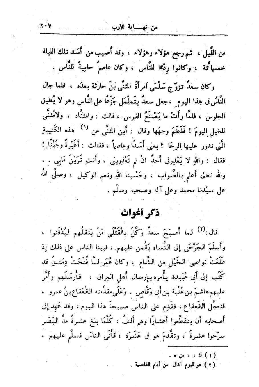 وكان سعد تزوّج سلمى امرأة المثنّى بن حارثة بعده، فلما جال النّاس فى هذا اليوم، جعل سعد يتململ جزعا على النّاس وهو لا يطيق الجلوس، فلمّا رأت ما يصنع الفرس، قالت: وامثنّاه، ولا مثنّى للخيل اليوم! فلطم وجهها وقال: أين المثنّى عن [1] هذه الكتيبة الّتى تدور عليها الرحا؟ يعنى أسدا وعاصما؛ فقالت: أغيرة وجبنا! فقال: والله لا يعذرنى أحد ان لم تعذرينى، وأنت ترين مابى ...